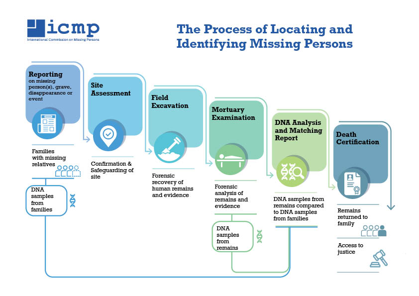 When a DNA match has been found, identification is confirmed by a legal authority. This authority or institution will evaluate all the available evidence – missing persons report, reference samples and ante-mortem data, field operations, examination, and DNA Match report. When a positive identification is confirmed, a death certificate is issued and the family is informed.